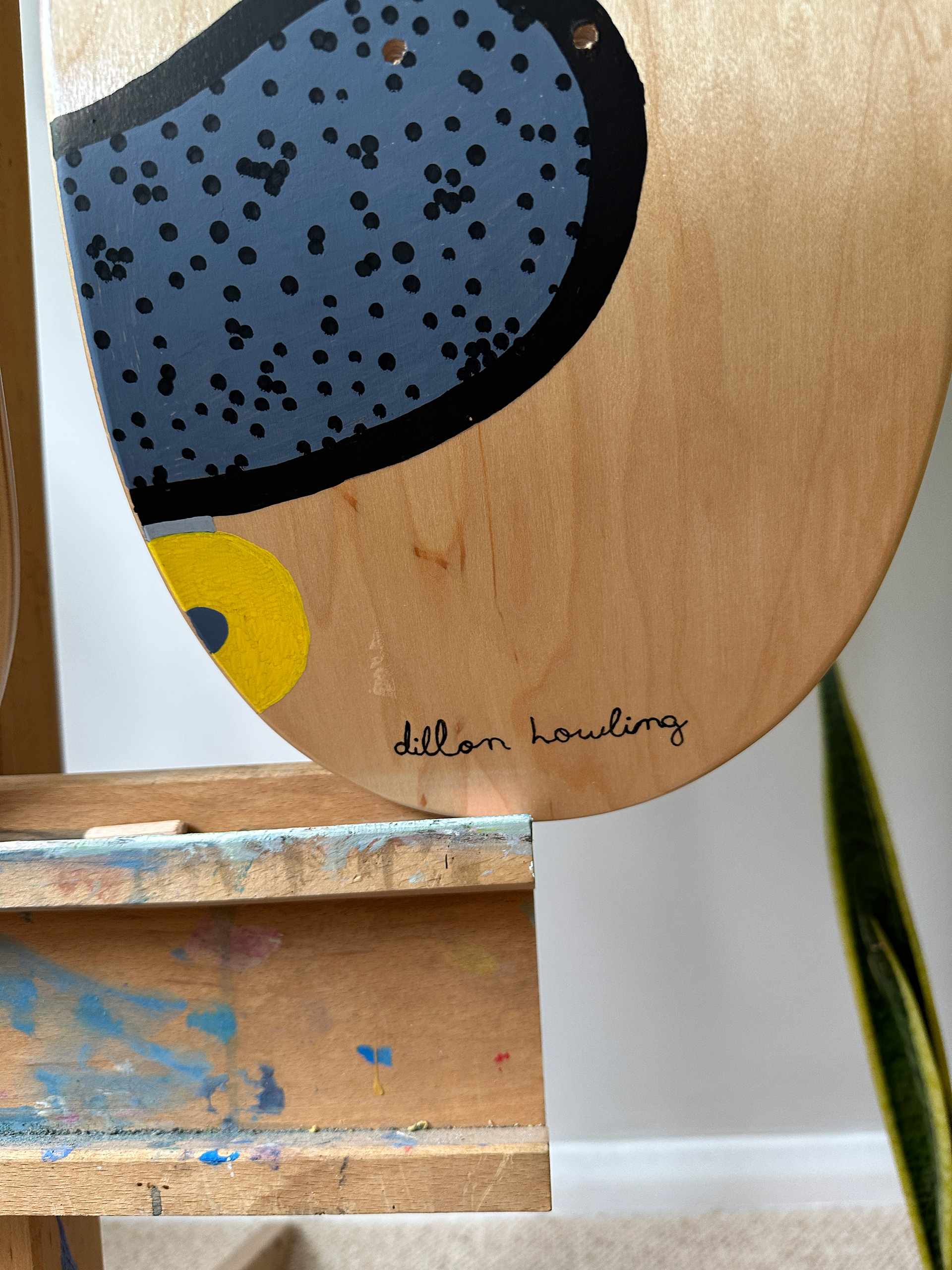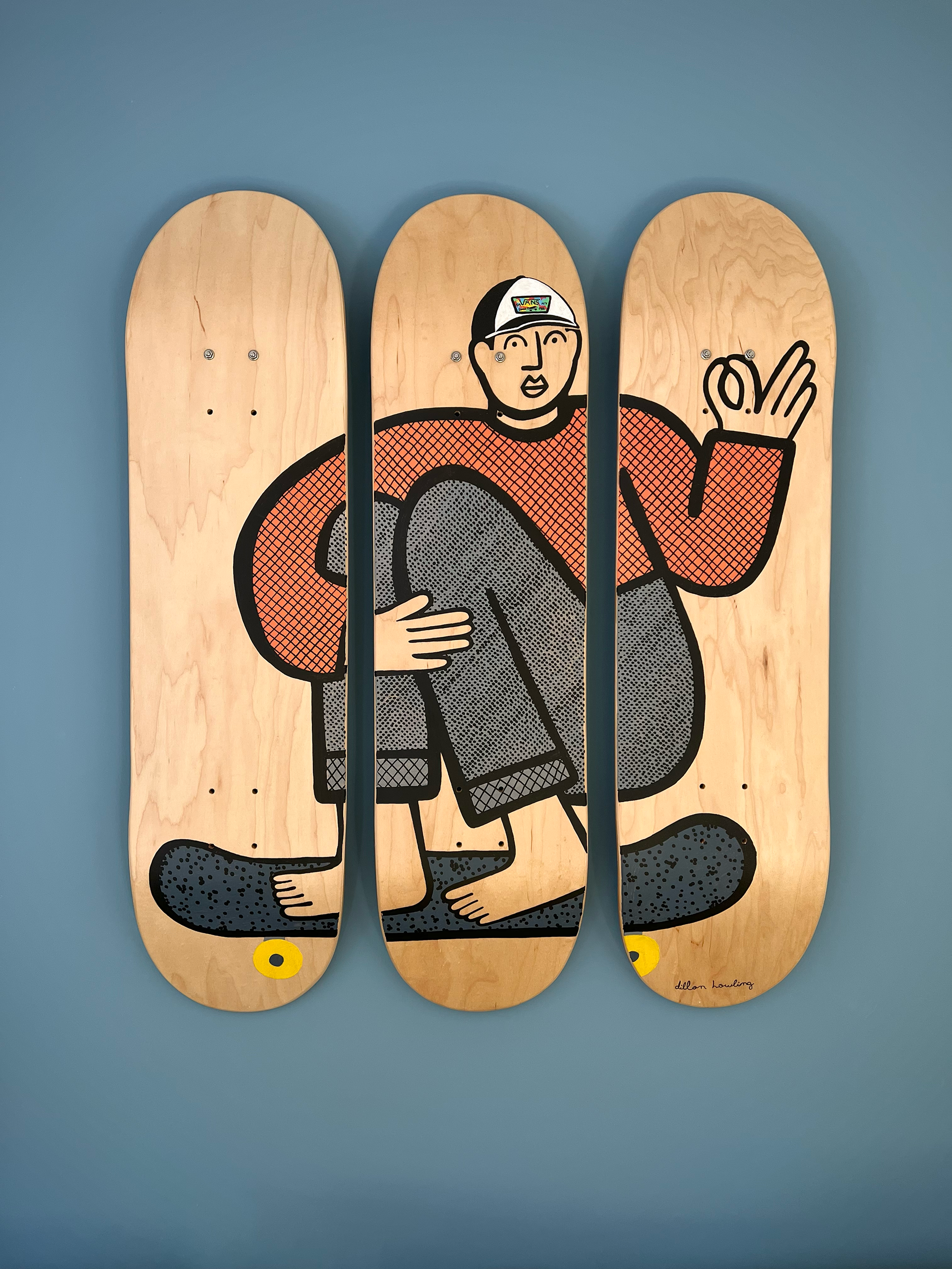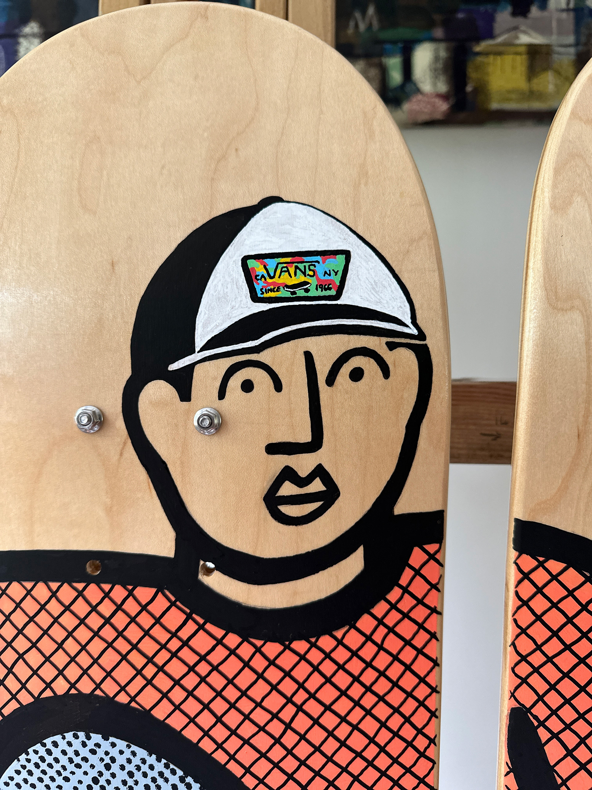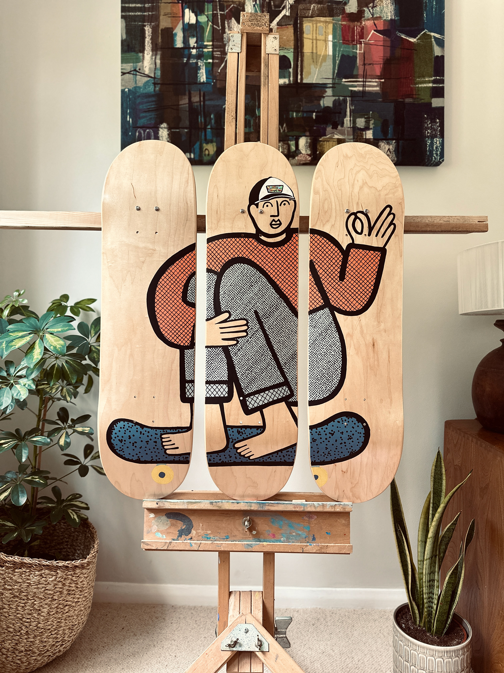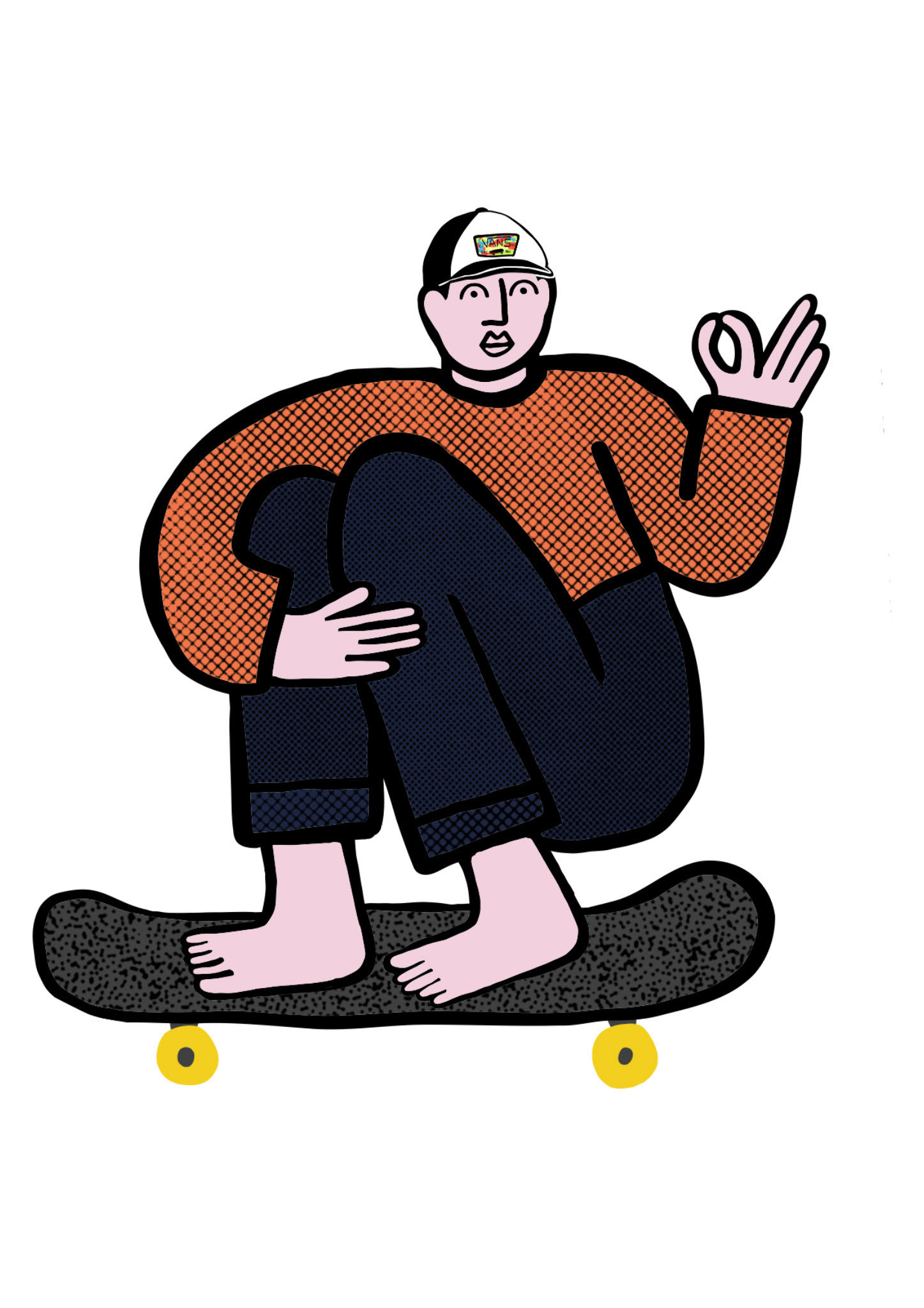 the brief: A large original illustration for my sons room. He likes skateboarding and he always wears this vans cap. The room will have pops of yellow.
