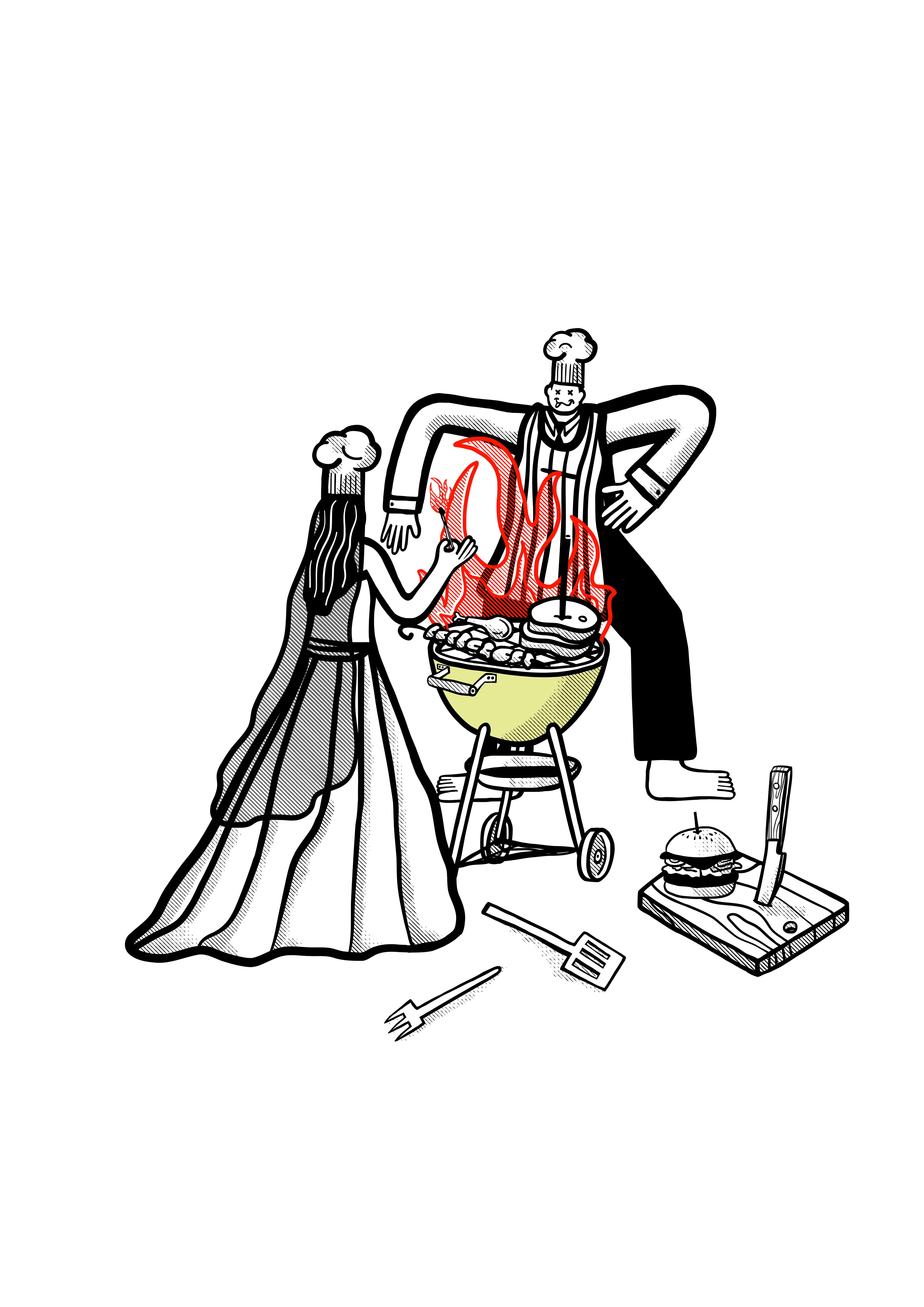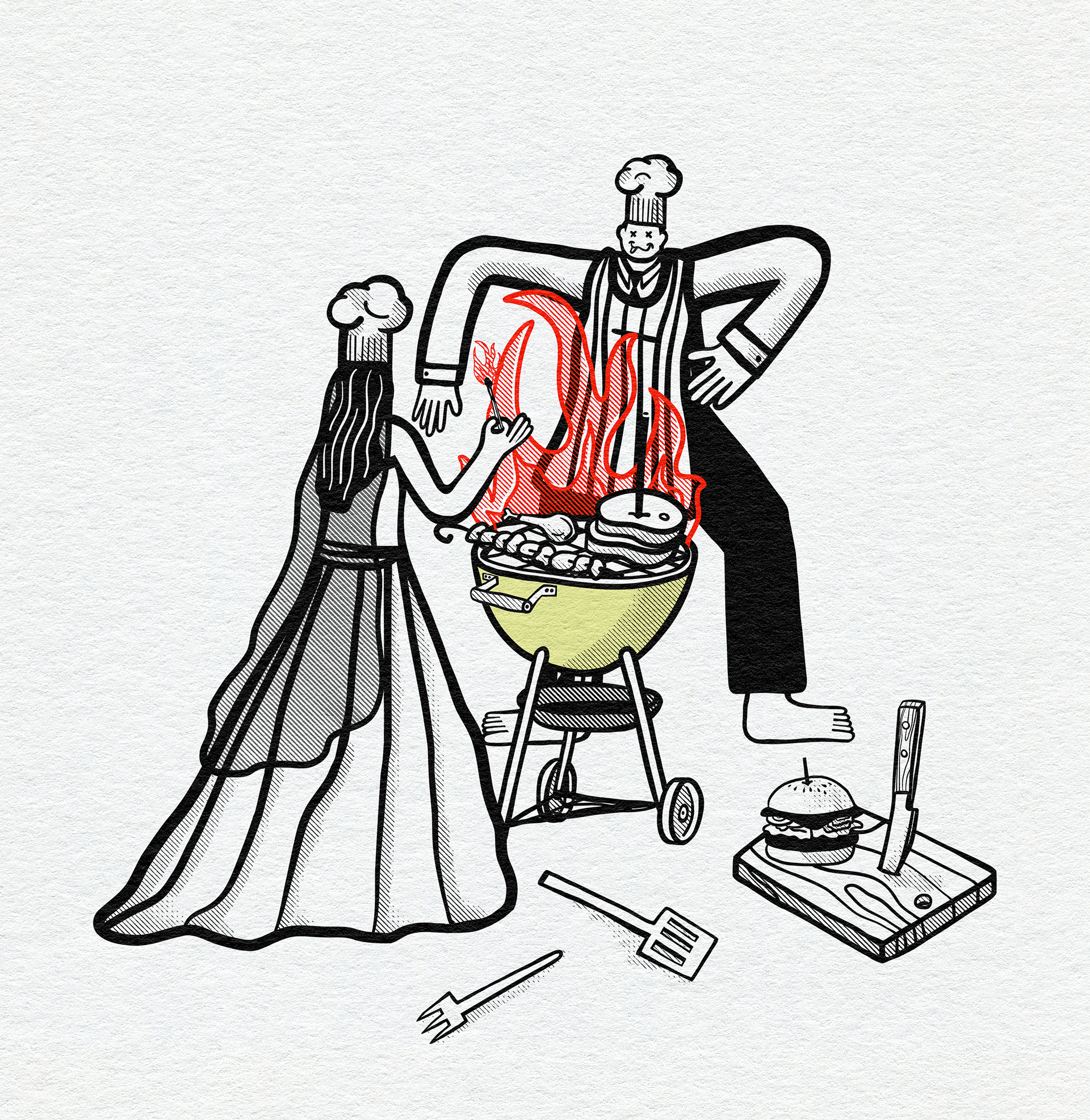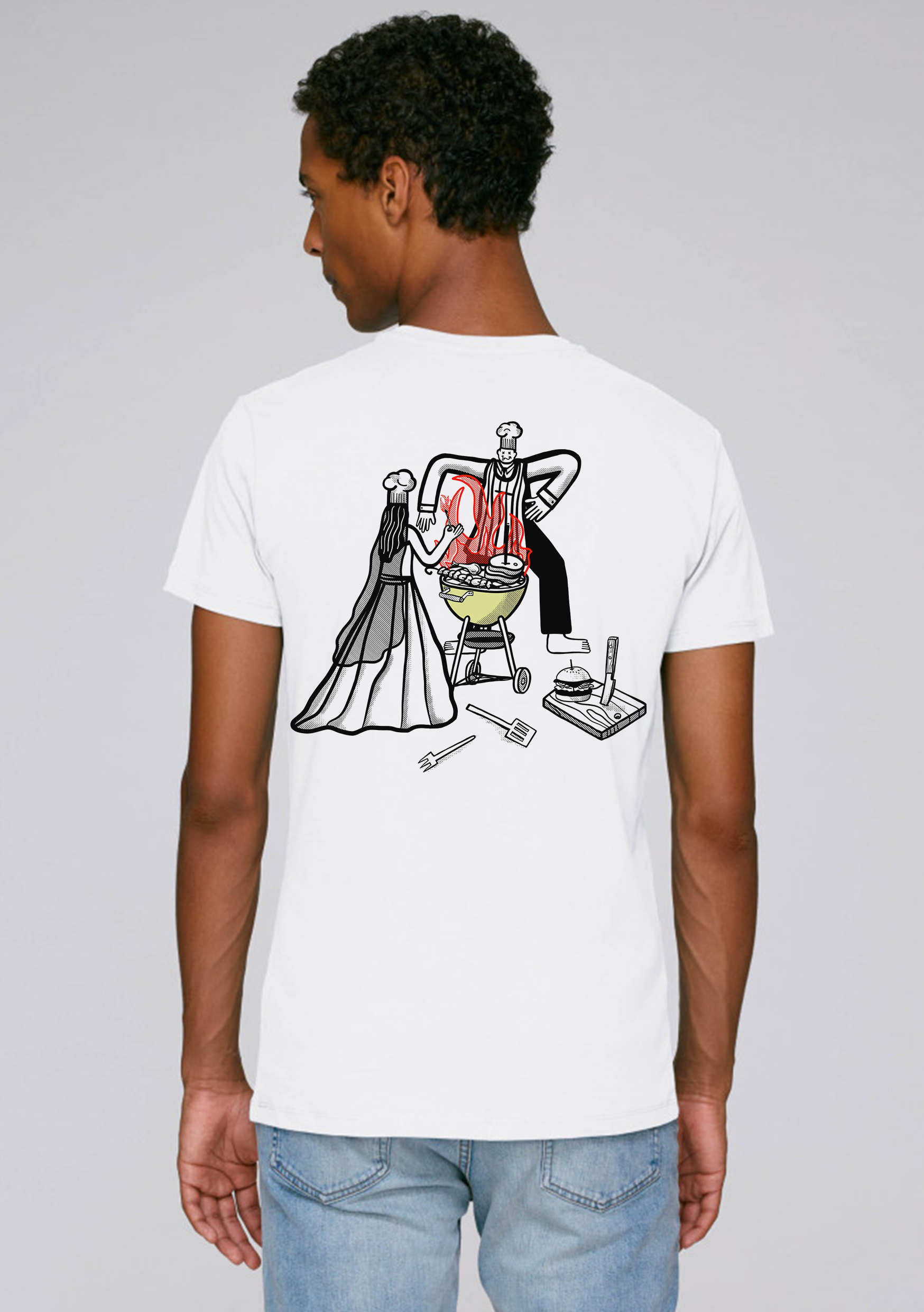 the brief: create a graphic T for a BBQ festival with a wedding theme and include the words Holy Meatrimony. preferably Red with a yellowy green kettle BBQ.