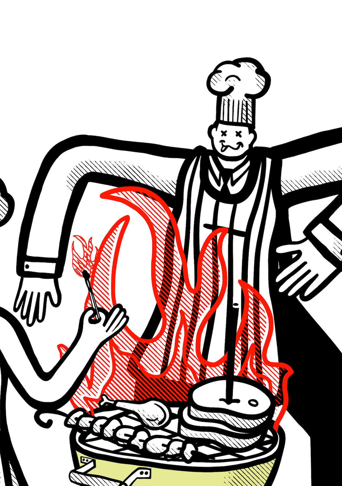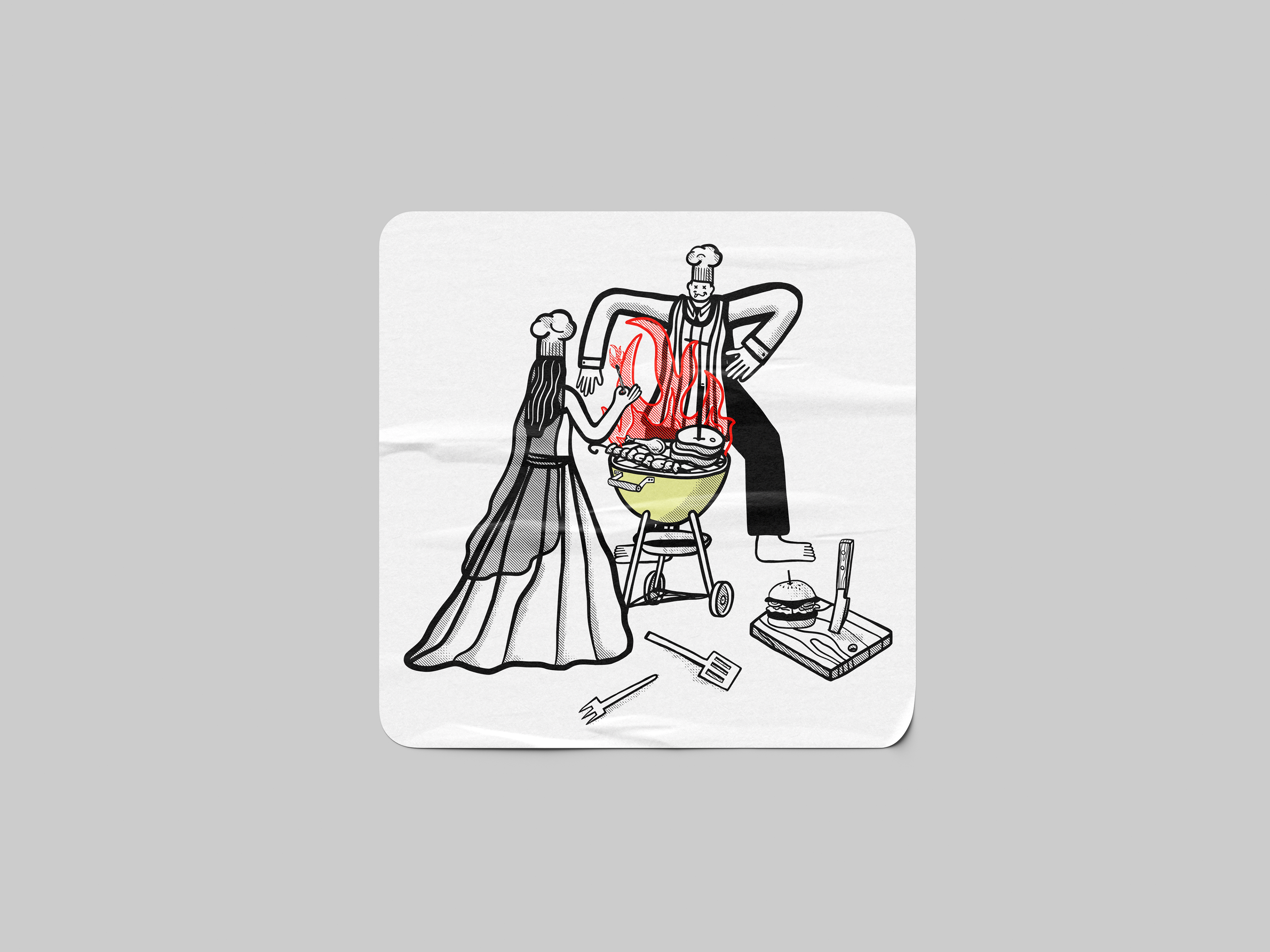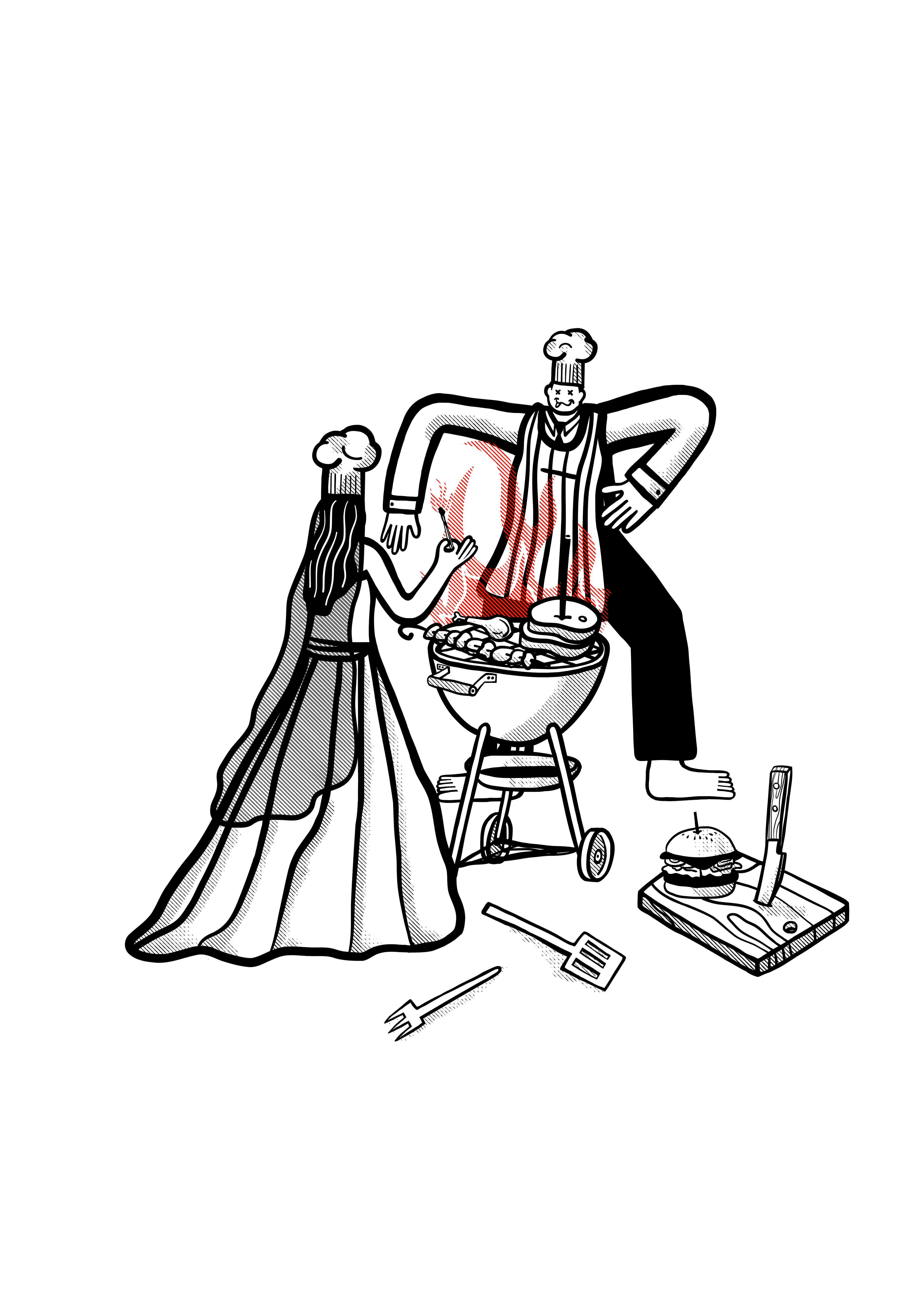 the brief: create a graphic T for a BBQ festival with a wedding theme and include the words Holy Meatrimony. preferably Red with a yellowy green kettle BBQ.